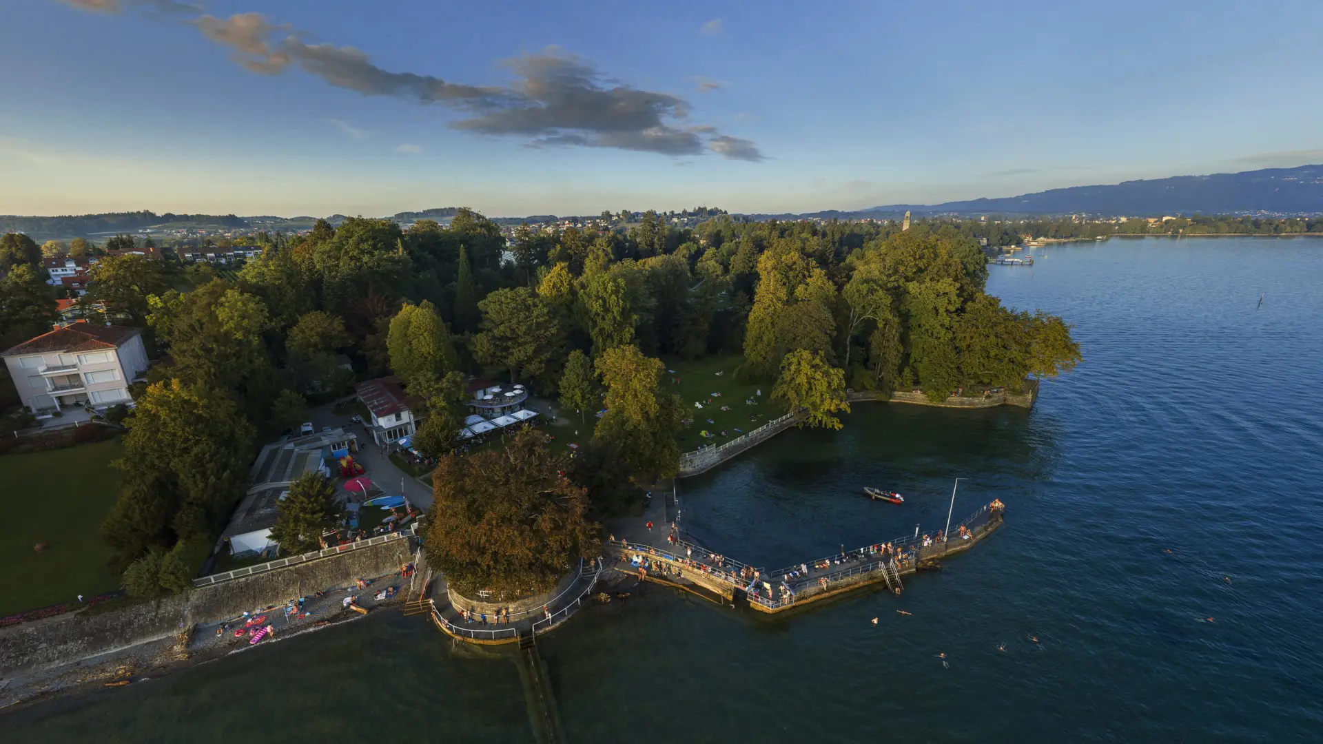 Im malerischen Lindenhofpark in Lindau (Bad Schachen) befindet sich das einstige “Seebad Lindenhof”, idyllisch am Ufer des bayrischen Bodensee gelegen. Seit 2013 ist die Anlage für Besucher frei zugänglich und erfreut sich großer Beliebtheit als Ausflugsziel. Von hier aus können Sie ein beeindruckendes Panorama genießen, das sich von der Insel Lindau über den Bregenzerwald bis hin zu den majestätischen Schweizer Alpen erstreckt.
